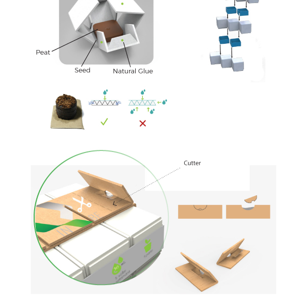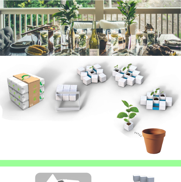 In-Qbe is a starter kit that allows to grow plants until they are big enough to be put in a vase. The cardboard can be buried with the whole plants because it is biodegradable and prevents them from racking shock.
