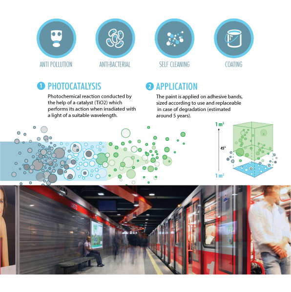 When the paint is properly illuminated by LED, it activates a photocatalytic process that oxidise contaminants and make them helpless. This reaction is able to purify up to 1 m³ of air in less than one minute.