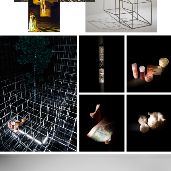 The installation will enclose the different paths and dimensions explored in the exhibition: material and immaterial. Products displayed in this structure are part of a vision for the future of human-being, according to a pair of issues: the self-protection from contaminated environment and the evolution of human species.