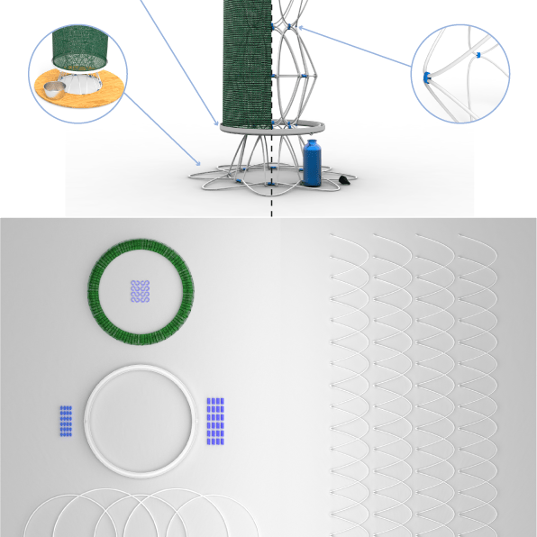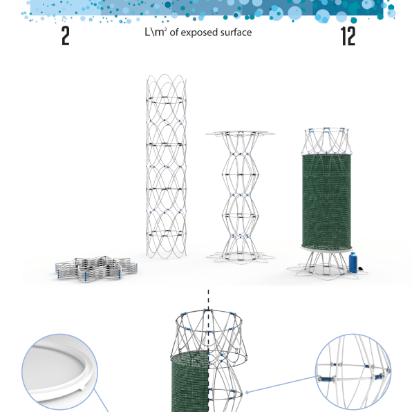 The core of Water Tom is a telescopic structure inspired by Mandala due to the flexibility of the structure and the multiple possibilities to rearrange its shape, covered by a net that undergoes a treatment by which Water Tom is able to traps and collect water from volatile particles. It’s designed to be lightweight and easy to use when there is no water nearby.